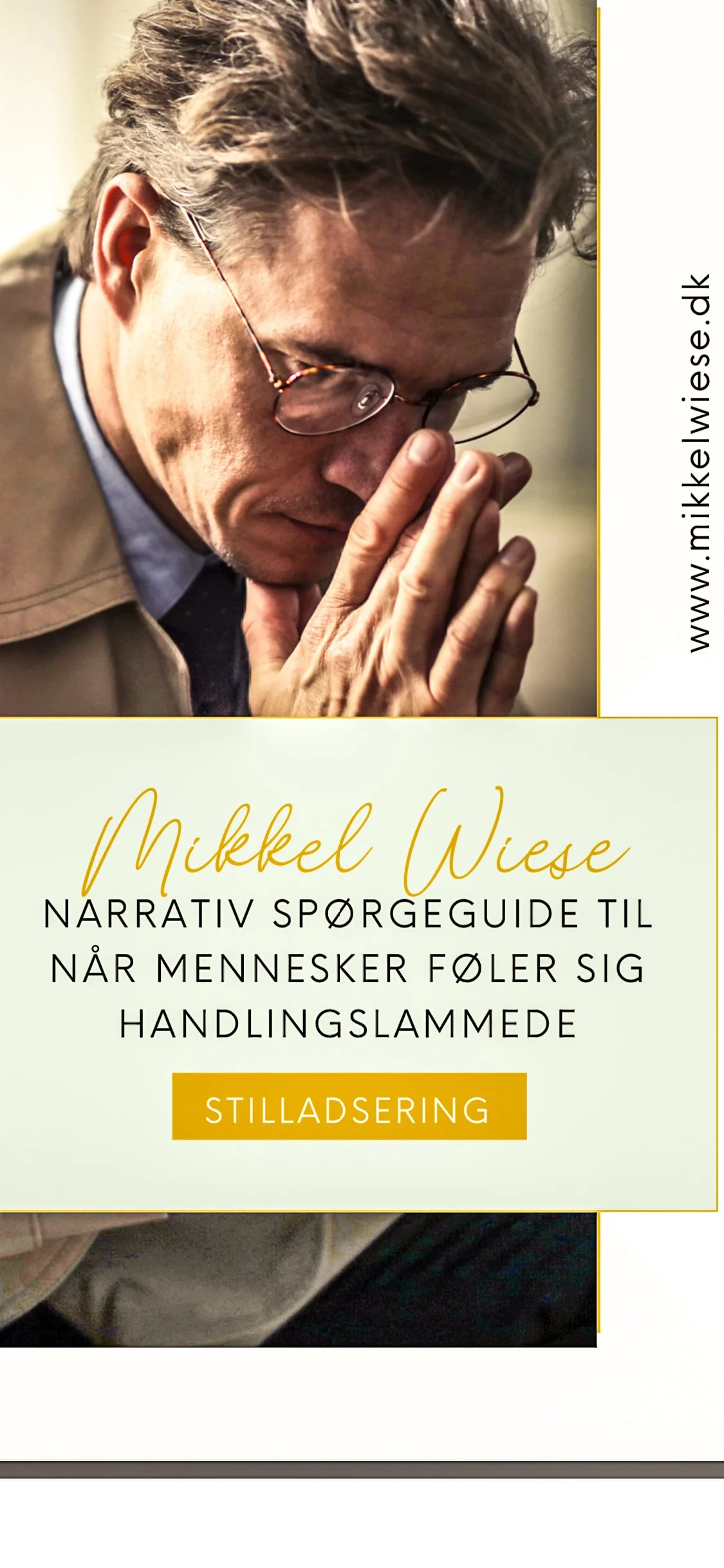 Narrative samtale og narrativ terapi tager udgangspunkt i de problemer, som folk oplever i de problemer som som holder folk nede, og de problemer, som folk ville ønske de ikke blev udsat for blev udsat for. Og på den måde så adskiller narrative narrative tilgang sig, narrativ praksis sig fra mange af de andre retninger, der er fremme i dag. Positiv psykologi, den løsningsfokuserede tilgang, hvor det både handler om måske at tale meget lidt om problemerne eller slet tale om problemerne og til gengæld nå meget hurtige frem til, hvordan man kan løse de her problemer, som man helst ikke vil tale om.